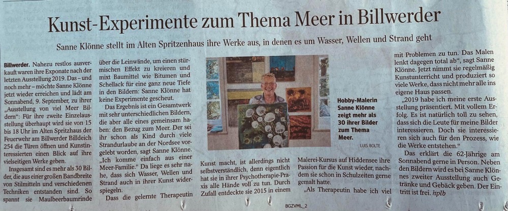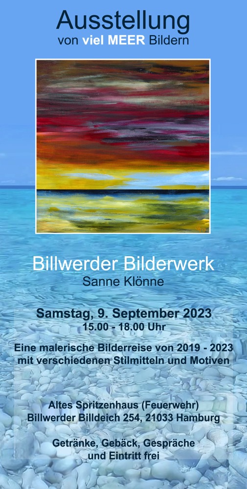 Da ich schon viele Exponate gemalt habe, die nicht mehr in unsere Wohnung passen, entschloss ich mich, im September 2019 eine Einzelausstellung in meinem Lieblingsort Billwerder durchzuführen. Es hat mich sehr gefreut, dass so viele Menschen gekommen sind. Ich habe mir keinen bestimmten Malstil angeeignet, sondern begeistere mich für Unter- schiedliches. Das große Interesse an meinen Werken regt an, weiter zu malen mit den verschiedensten Stilen.